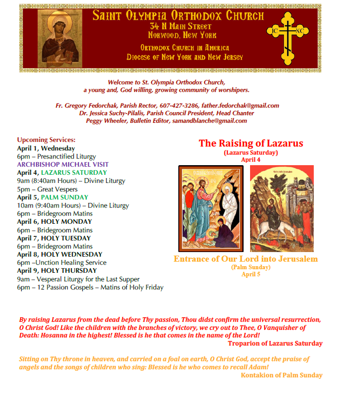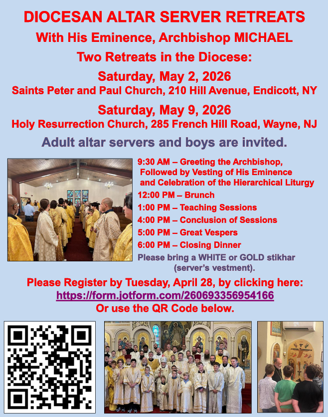 Archbishop Michael is coming this Wednesday for the Liturgy of the Presanctified Gifts at 6PM. Please make every effort to attend.
