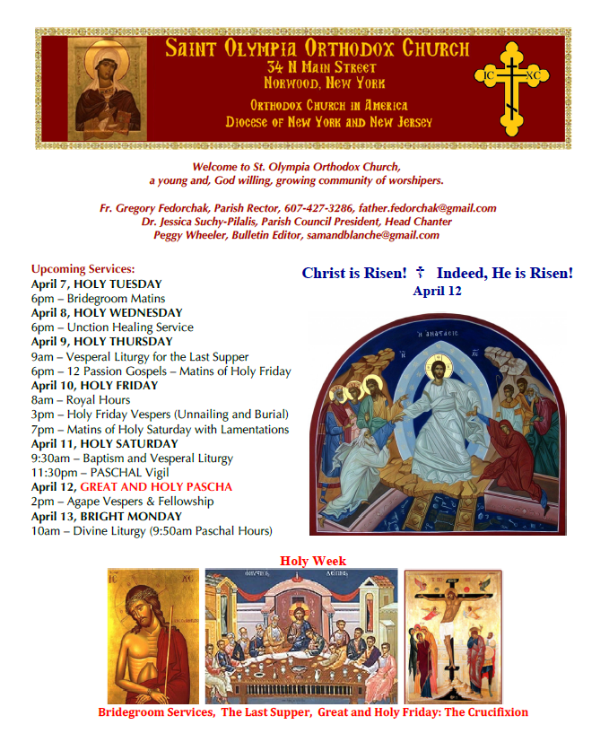 Parishioners of St. Olympia Orthodox Church are from many different backgrounds: American, Greek, Russian, Albanian, Ukrainian, English, Coptic, Hispanic, Native American, etc. Services are primarily in English, and the music is from both the Byzantine chant and Russian choral traditions.