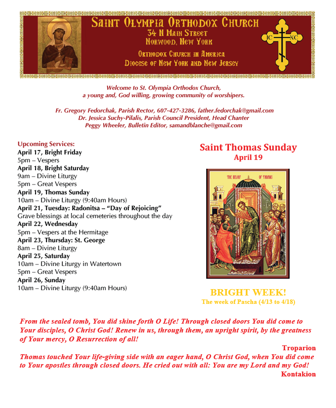 Attached is the bulletin. And here are links to excellent Paschal letters from Metropolitan Tikhon and Archbishop Michael.