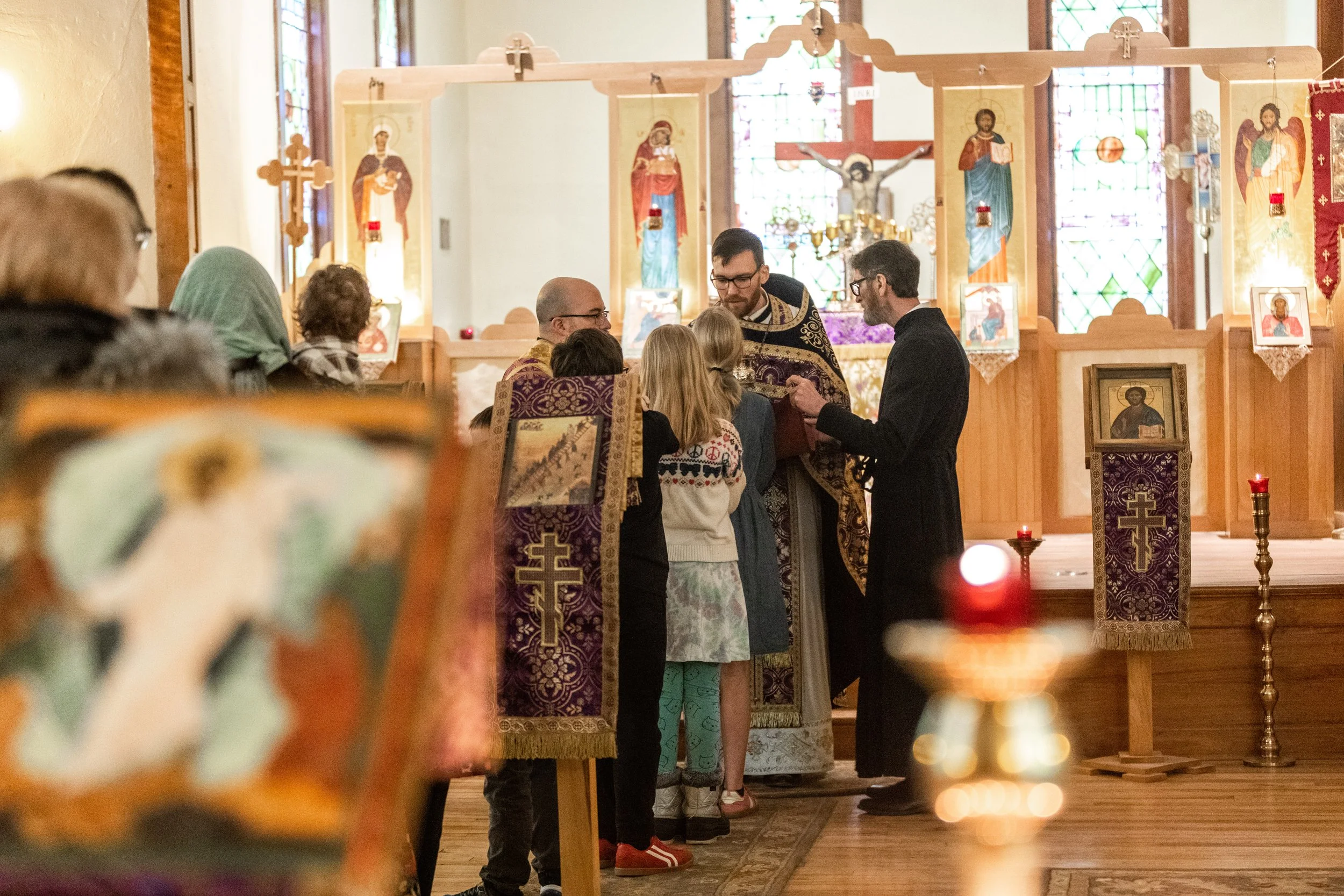 We kiss each other before we take communion (“Greet one another with a kiss of love,” 1 Peter 5:14). When Roman Catholics or high-church Protestants “pass the peace,” they give a hug, handshake, or peck on the cheek; that’s how Westerners greet each other. In Orthodoxy different cultures are at play: Greeks and Arabs kiss on two cheeks, and Slavs come back again for a third. Follow the lead of those around you and try not to bump your nose.